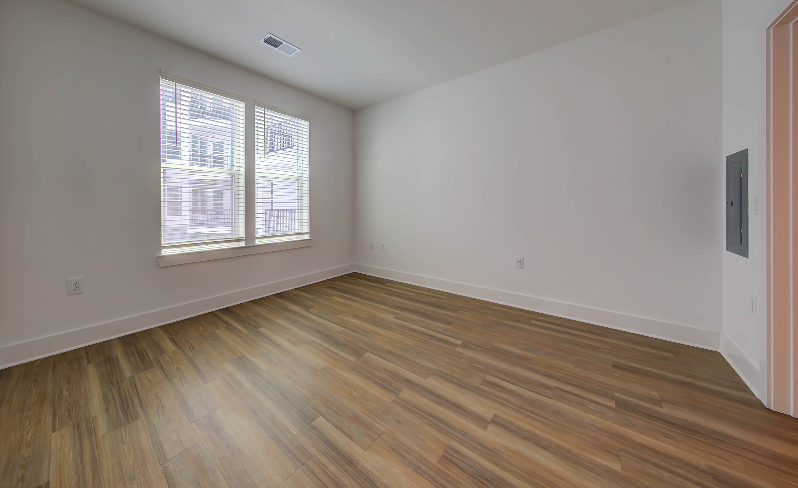 - Open-concept living and dining area with luxury hardwood-style flooring