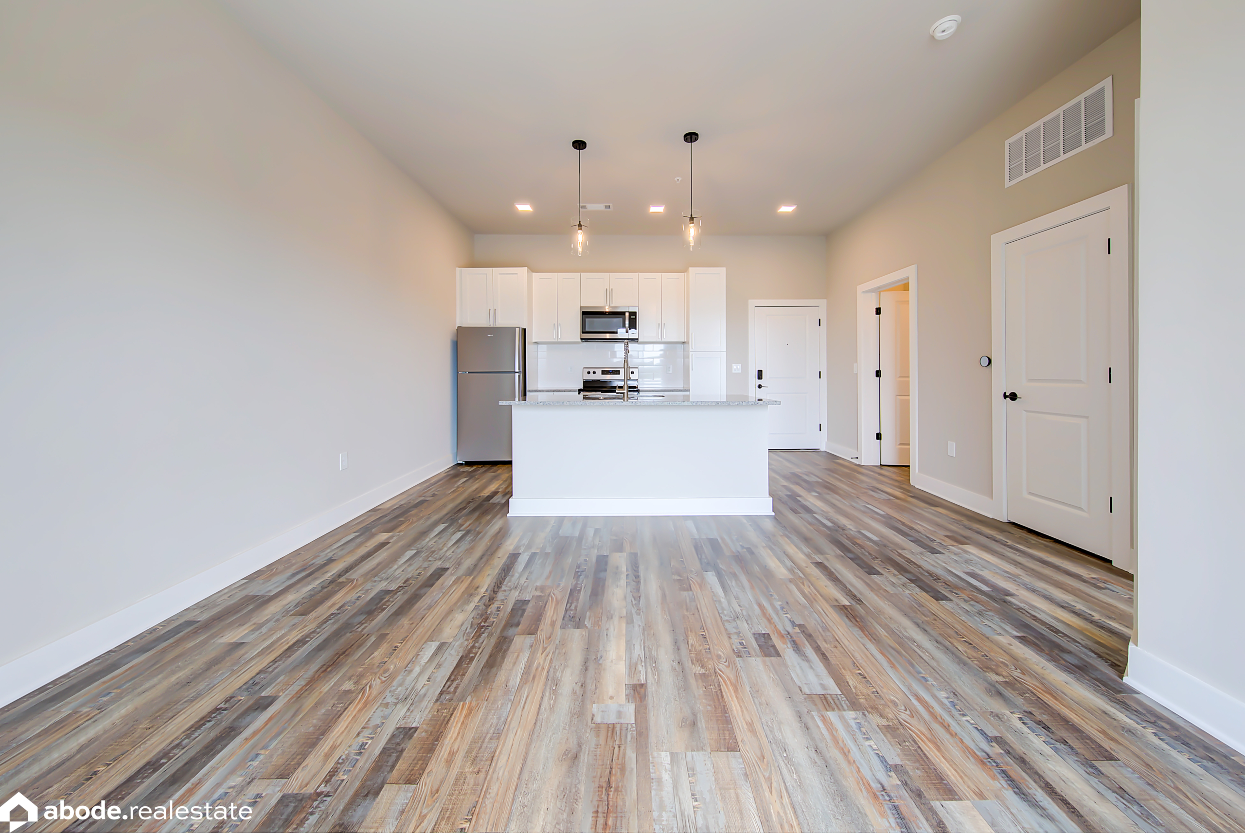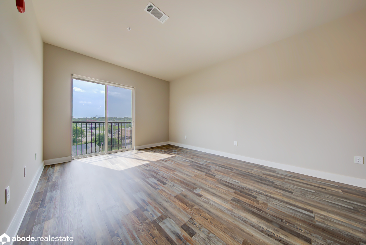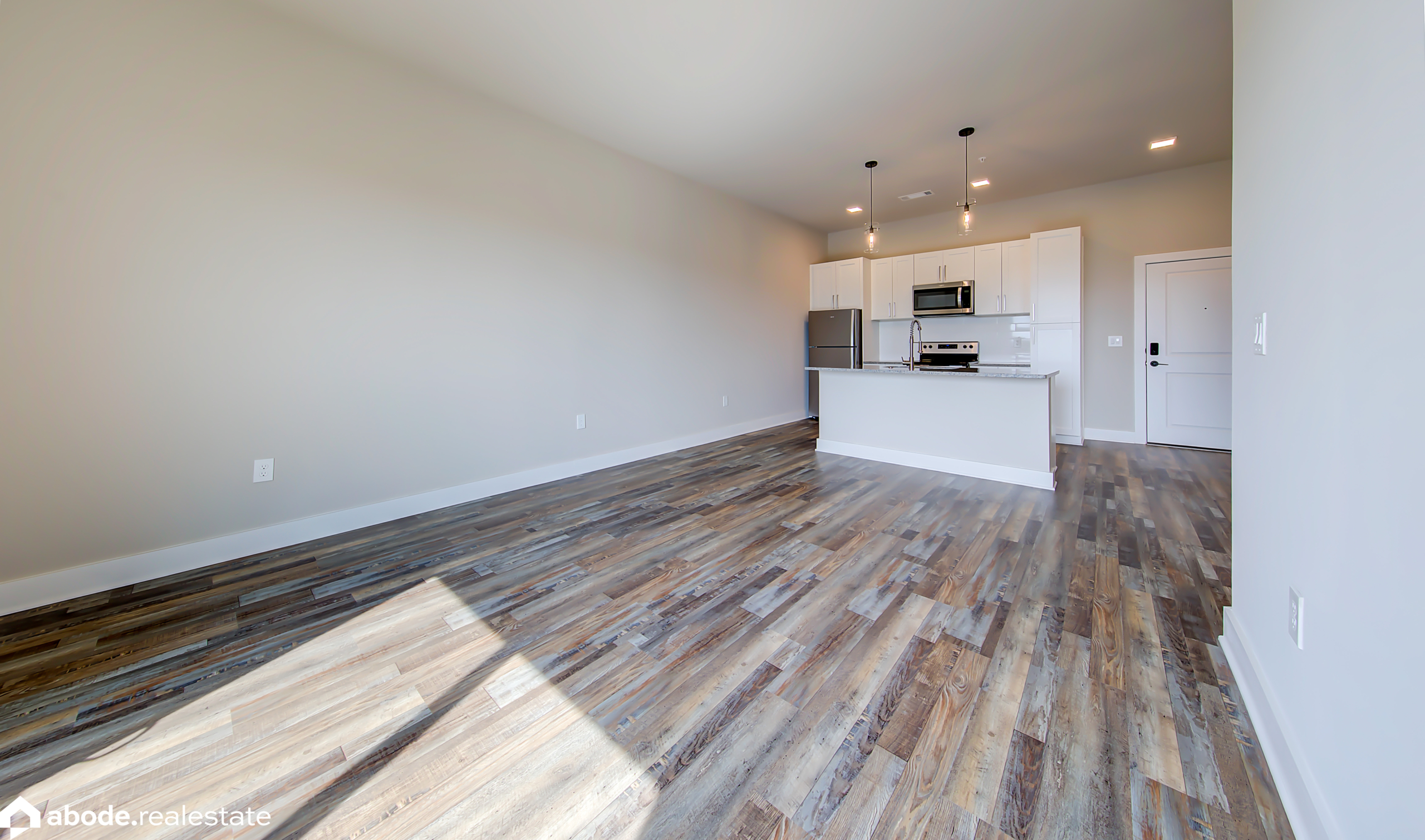- Open-concept studio layout with wood-style plank flooring and abundant natural light